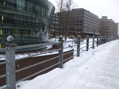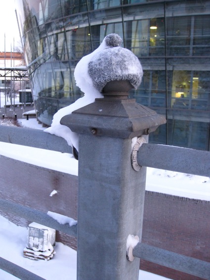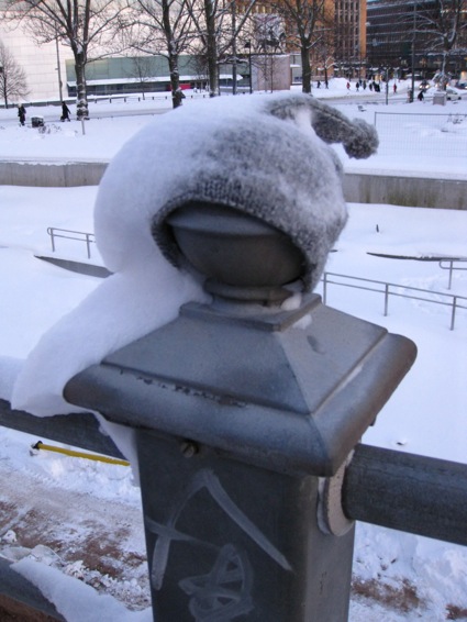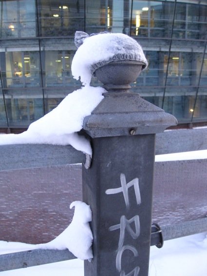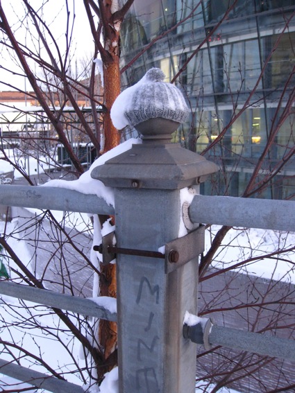 February 2012, in Helsinki, on Pohjoinen Rautatiekatu, between Parlament house and Little Parlament, on the fence post, from the very beginning 54 grey knitted woolly hats.