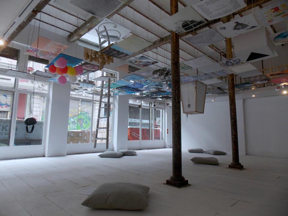 one hundred artists and creative groups from all over the world turn their gaze upwards, permeating what is directly visible and contributing to the composition of one large-scale sky/panorama which covers the ceiling of metamatic:taf’s gallery.
